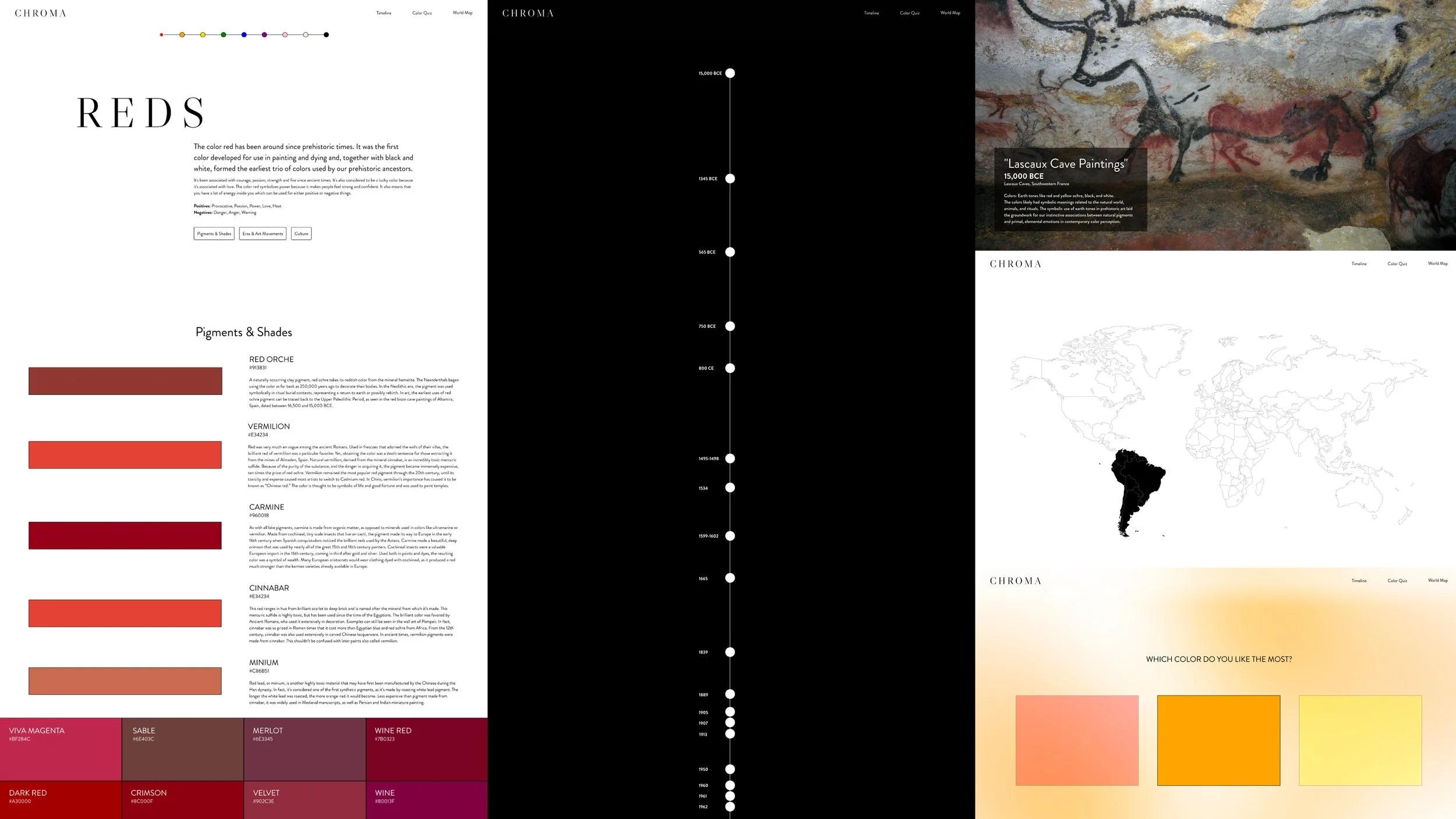 Beyond the homepage, the site is divided into four main sections: the color pages (tied to the homepage), a timeline, a world map, and a quiz. Each of the other three sections has its own introductory page before leading into the main content, mirroring the user experience on the homepage.